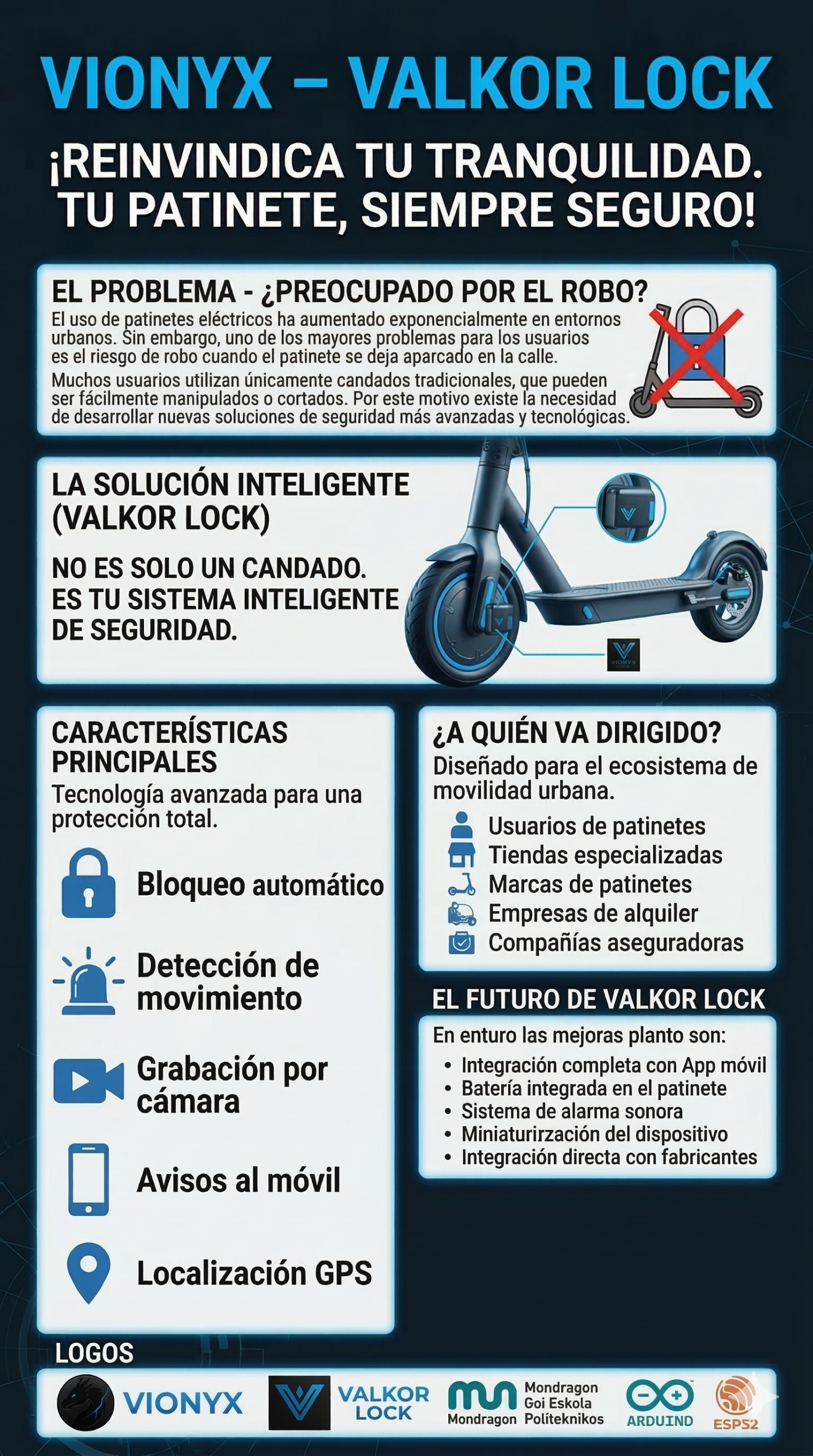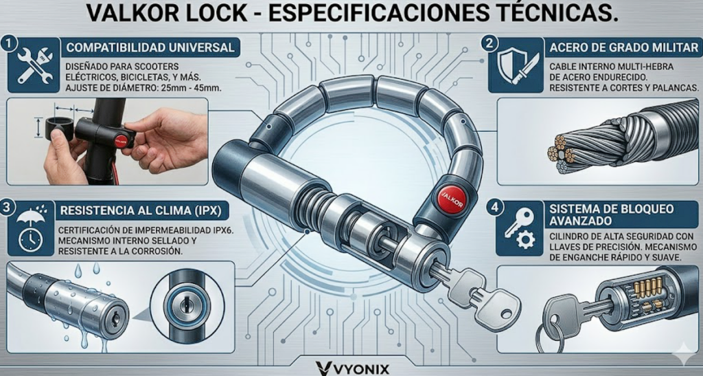 Valkor Lock nace para romper con eso. Es un dispositivo de bloqueo inteligente que combina materiales robustos con un diseño ergonómico que se integra perfectamente en el chasis de tu patinete.